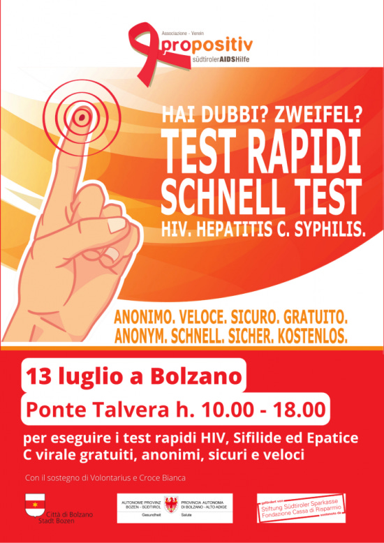 sabato 13 luglio al Ponte Talvera angolo passeggiate S. Quirino, dalle ore 10.00 alle ore 18.00 si terrà una giornata di testing per l’HIV, la Sifilide e l’Epatite C Virale.